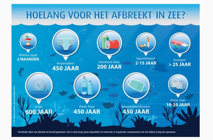 Opdracht 3: had je gedacht dat het zo lang duurt voor afval afgebroken is in de zee? Van welk afval ben je het meeste verbaasd dat het zo lang duurt voor het afgebroken is?